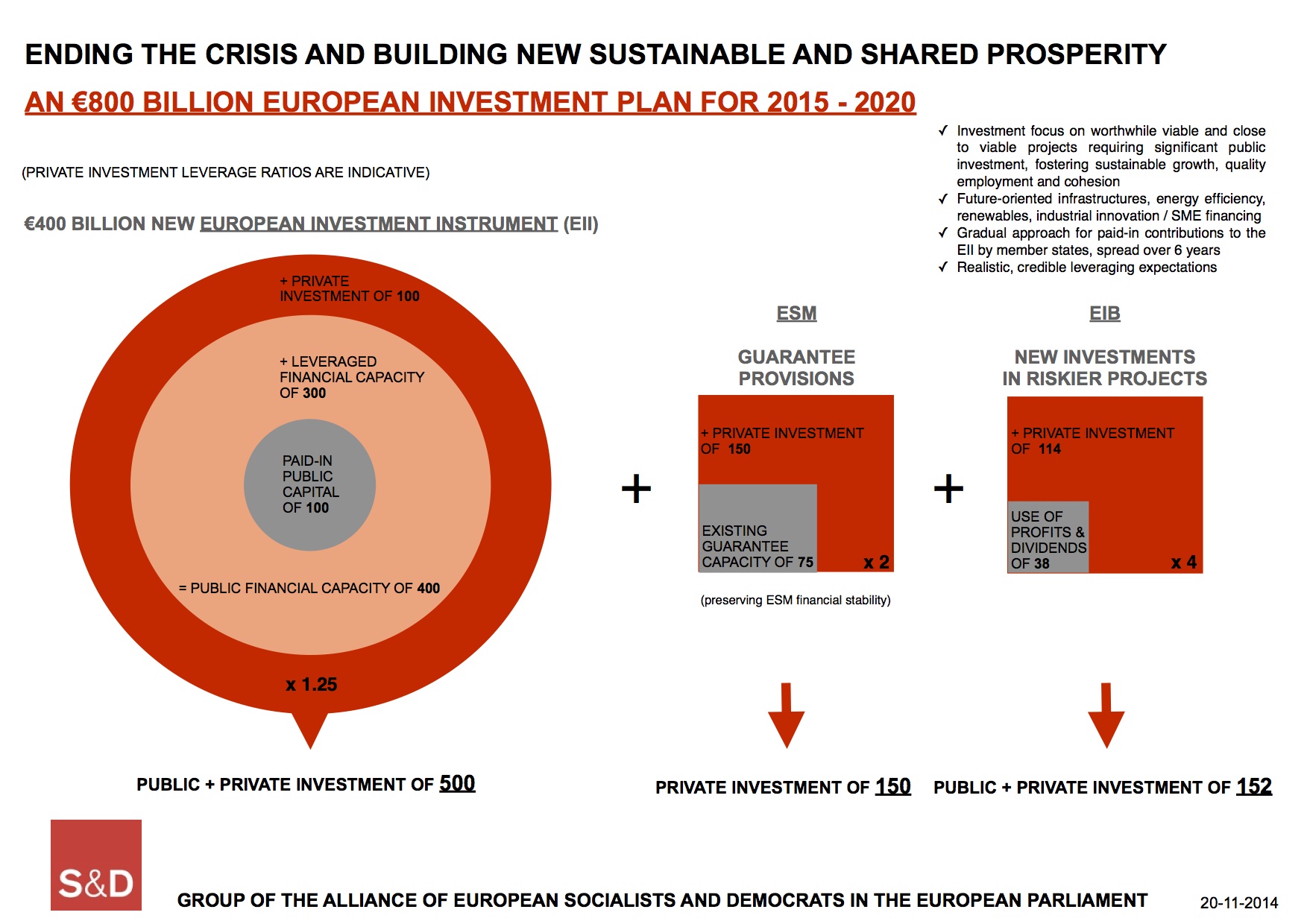 « Nous ne soutiendrons pas un « faux » plan d’investissement. Nous avons besoin d’argent frais. Voilà pourquoi nous proposons de créer un fonds spécial. Le capital initial sera progressivement assuré par les États membres de l’UE afin d’atteindre 100 milliards € dans les six ans. Ces contributions nationales devraient être exclues du calcul du déficit public et de la dette publique.