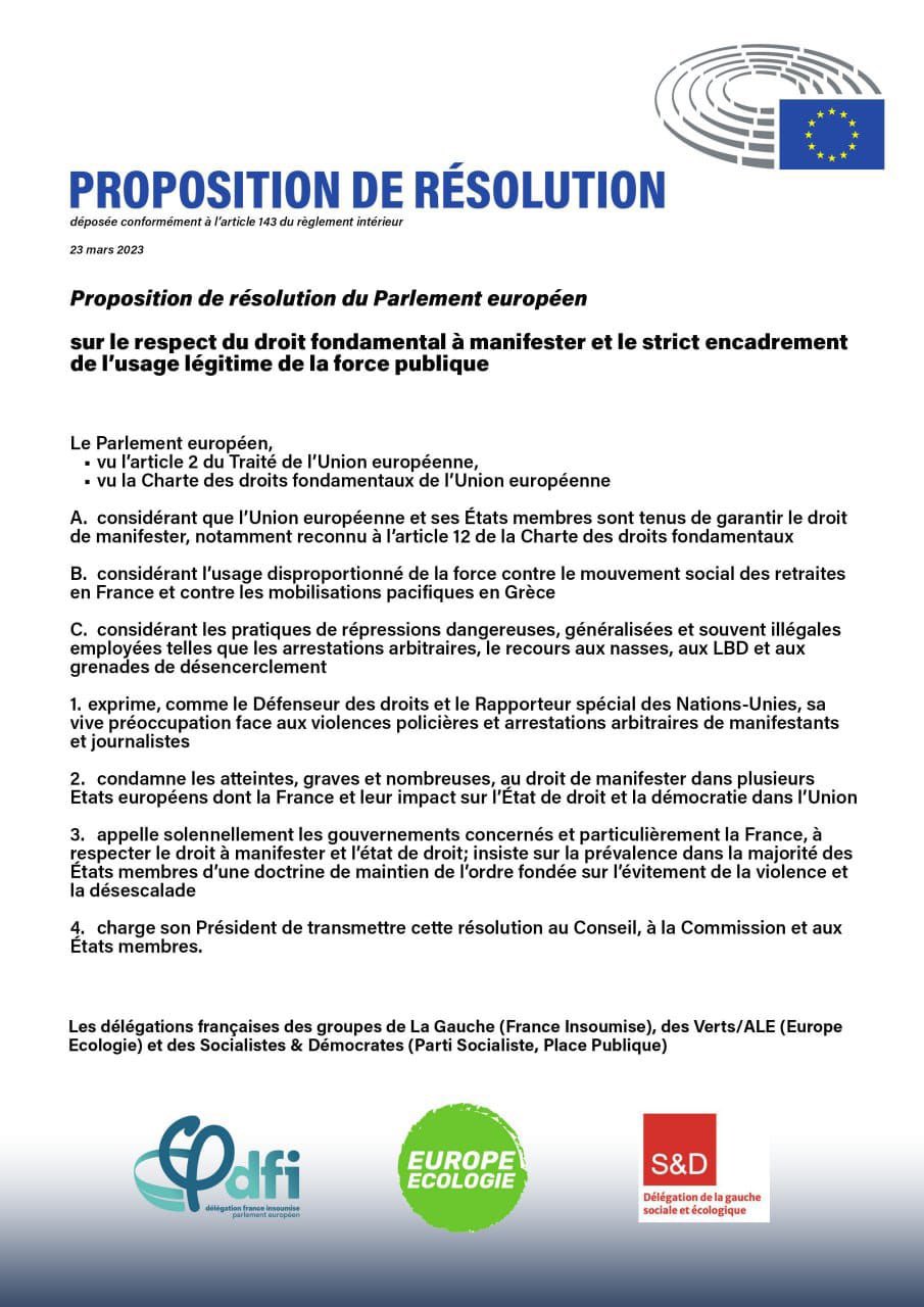 Les délégations françaises des groupes de La Gauche (France Insoumise), des Verts/ALE (Europe Écologie) et des Socialistes & Démocrates (Parti Socialiste, Place Publique) déposent une motion de résolution commune appelant le Parlement européen à condamner les violences policières à l’encontre des manifestants et des journalistes en France.